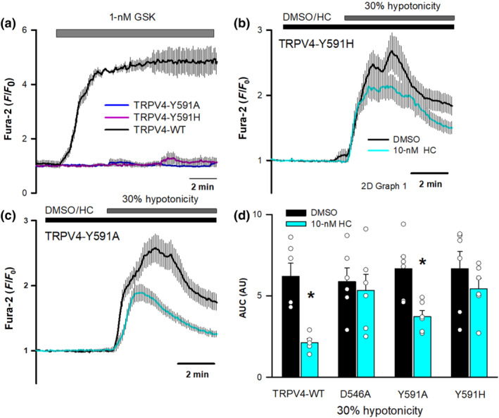 FIGURE 4. Effect of hTRPV4‐Y591 mutations on HC067047 inhibition. (a) Changes in intracellular [Ca2+] in HeLa cells transfected with hTRPV4‐WT (n = 30), hTRPV4‐Y591A (n = 31), or hTRPV4‐Y591H (n = 34) cDNAs after perfusion with 1‐nM GSK1016790A. (b, c) Changes in intracellular [Ca2+] in HeLa cells transfected with hTRPV4‐Y591H (b) or hTRPV4‐Y591A (c) cDNAs after perfusion with a 30% hypotonic solution in the presence (Y591H, n = 96; Y591A, n = 92) or absence (Y591H, n = 75; Y591A, n = 69) of 10‐nM HC067047. (d) Mean and individual dot plots of the AUC in HeLa cells transfected with the indicated cDNAs and exposed to 30% hypotonic solutions in the presence or absence of 10‐nM HC067047. N = 6 for all conditions except DMSO TRPV4‐WT (n = 7) and DMSO TRPV4‐D546A (n = 5)