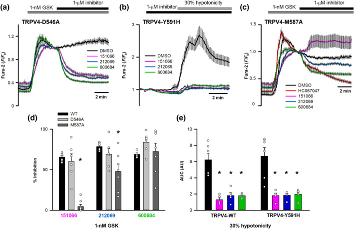 FIGURE 9. Effect of D546A, Y591H and M587A mutations on the inhibitory activity of the new inhibitors. (a) Changes in intracellular [Ca2+] in HeLa cells transfected with hTRPV4‐D546A (DMSO, n = 30; 151066, n = 39; 212069, n = 48; 600684, n = 54) after perfusion with 1‐nM GSK1016790A and addition of different inhibitors (or vehicle) at 1 μM. (b) Changes in intracellular [Ca2+] in HeLa cells transfected with hTRPV4‐Y591H after perfusion with a 30% hypotonic solution in the presence or absence of different inhibitors (DMSO, n = 40; 151066, n = 49; 212069, n = 52; 600684, n = 55) at 1 μM. (c) Changes in intracellular [Ca2+] in HeLa cells transfected with hTRPV4‐M587A (DMSO, n = 63; 151066, n = 90; 212069, n = 84; 600684, n = 104) after perfusion with 1‐nM GSK1016790A and addition of different inhibitors. (d) Percentage inhibition of GSK1016790A‐induced increases in intracellular Ca2+ concentrations generated by TRPV4‐WT (151066, n = 6; 212069, n = 6; 600684, n = 5), TRPV4‐D546A (n = 6 for all compounds) and TRPV4‐M587A (151066, n = 8; 212069, n = 7; 600684, n = 7) channels using different compounds. (e) Mean and individual dot plots of the AUC in HeLa cells transfected with the indicated cDNAs and exposed to 30% hypotonic solutions in the absence (black) or the presence of 1 μM of 151066 (pink), 212069 (blue) or 600684 (green). N = 5 for all conditions except for both control conditions (n = 6)