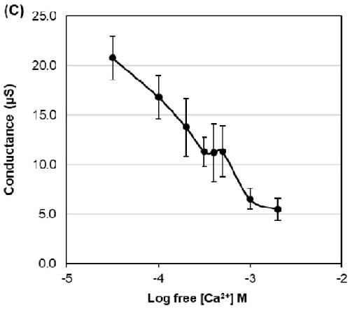 Figure 1. Electrophysiological survey to test for HvPIP2 ion transport (A,B) Currentâvoltage relationships of X. leavis oocytes expressing each HvPIP2 in the presence of 86.4 mM NaCl and 9.6 mM KCl with 30 µM Ca2+ (A) or 1.8 mM Ca2+ (B). A total of 10 ng of each HvPIP2 cRNA or water (control) was injected into X. laevis oocytes. (C) Relationships between the external free Ca2+ concentration and HvPIP2;8-mediated Na+ conductance in the presence of 86.4 mM NaCl and 9.6 mM KCl (R2 = 0.93). The free Ca2+ concentrations are given in Methods. A step pulse protocol of â120 mV to +30 mV with a 15 mV increment was applied on every oocyte. Ionic conductance was calculated based on the data obtained from V = â75 mV to â120 mV of the membrane potential. Data are the means ± SE (n = 5 for A,C, and n = 7 for B).