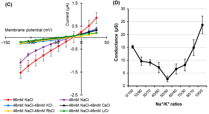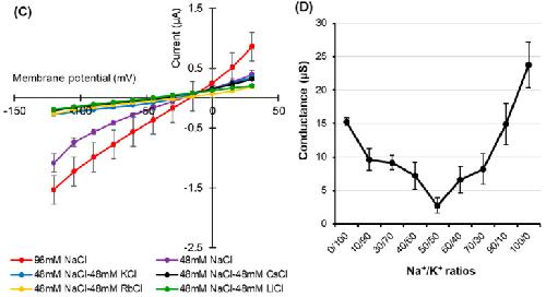 Figure 2. Monovalent alkaline cation selectivity of HvPIP2;8 and the effect of the interaction of K+ and Na+ on HvPIP2;8-mediated ion conductance activity. Current–voltage relationships obtained from oocytes either expressing HvPIP2;8 (A) or injected with water (B) HvPIP2;8 displays a different monovalent alkaline cation selectivity. Oocytes were successively immersed in bath solutions with a high calcium condition, supplemented with Na+, K+, Cs+, Rb+, and Li+ (as chloride salts) at the concentration of 96 mM. (C) Inhibition of HvPIP2;8-mediated Na+ transport by monovalent alkaline cations in the presence of 48 mM NaCl with 48 mM of each alkaline cation. (D) The effect of external Na+/K+ concentration ratios on the conductance of HvPIP2;8-expressing oocytes from V (membrane potential) = −75 mV to −120 mV. The total concentration of (Na + K) was constantly 96 mM. X. laevis oocytes were injected with 10 ng of HvPIP2;8 cRNA for the recording of the conductance in every experiment. Data are the means ± SE (n = 7 to 8 for A, n = 5 for B, n = 4 to 5 for C, and n = 5 to 6 for D).
