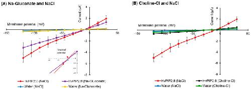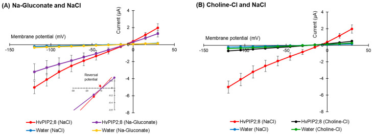 Figure 3. HvPIP2;8-mediated Na+ transport is Cl− independent. (A) Current–voltage relationships obtained from oocytes either expressing HvPIP2;8 or injected with water in the presence of either 96 mM NaCl or 96 mM Na-gluconate. Inset: Expanded current voltage curves around the reversal potential. (B) Current–voltage relationships obtained from oocytes either expressing HvPIP2;8 or injected with water in the presence of either 96 mM NaCl or 96 mM Choline-Cl. All solutions contained 30 µM Ca2+. X. laevis oocytes were injected with 10 ng of HvPIP2;8 cRNA. Data are the means ± SE (n = 7 to 8).