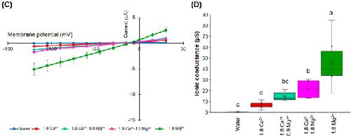 Figure 4. Effects of divalent cations on the ion current responses in oocytes expressing HvPIP2;8. (A) Effect of divalent cations on the ion currents of the HvPIP2;8-transporter; bath solutions with a high 1.8 mM Ca2+ background calcium conditions were successively replaced with either 1.8 mM Ca2+, Ba2+, Cd2+, and Mg2+ (as chloride salts), at concentrations of 86.4 mM NaCl and 9.6 mM KCl. (B) Box plot summary of the ionic conductance presented in (A); the ionic conductances were calculated from V = â75 mV to â120 mV. (C) Relief of Ca2+ inhibition by the addition of Mg2+ on the ion current responses in oocytes expressing HvPIP2;8; note the different range of the Y-axis from the plot in (A). (D) Box plot summary of the ionic conductance presented in (C). Steady-state currentâvoltage curves of the X. laevis oocytes injected with 10 ng of cRNA per oocyte were recorded. Currents from the oocytes injected with water were the negative controls from the same batch. Significant differences (p < 0.05) are indicated by different letters using one-way ANOVA with Duncanâs multiple comparisons test. Data are the means ± SE of three independent experiments, (n = 6 for A,B).