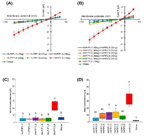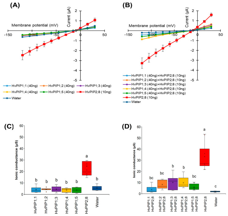 Figure 5. Co-expression of HvPIP1s and HvPIP2;8 reduces HvPIP2;8-dependent currents in X. laevis oocytes. (A) Currentâvoltage relationships obtained from oocytes either expressing HvPIP2;8 alone, each HvPIP1 alone, or injected with water; each HvPIP1 of the five HvPIP1s did not show ion channel activity when expressed alone. (B) Co-expression of HvPIP2;8 with each HvPIP1 largely inhibited the ion channel activity of HvPIP2;8. (C,D) Box plot summary of the ionic conductance for data shown in (A,B), respectively. Oocytes were injected with 10 ng cRNA of HvPIP2;8, 40 ng cRNA of each HvPIP1 in both the solo- and co-expression analyses. The bath solution included 86.4 mM NaCl, 9.6 mM KCl, 1.8 mM MgCl2, 1.8 mM EGTA, 1.8 mM CaCl2, 10 mM HEPES, and a pH 7.5 with Tris, and therefore the free Ca2+ concentration was 30 µM. Significant differences (p < 0.05) are indicated by different letters using one-way ANOVA with Duncanâs multiple comparisons test. Data are the means ± SE (n = 8).