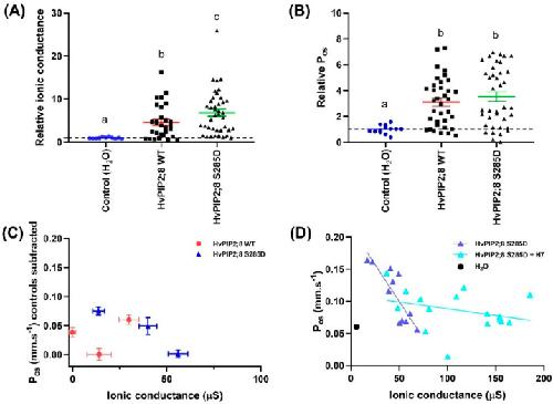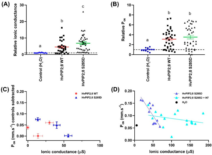 Figure 6. Phosphorylation mimic HvPIP2;8 S285D influences HvPIP2;8-facilitated cation transport. Oocytes were injected with 46 nL water (Control) or with 46 nL water (n = 11) containing 23 ng HvPIP2;8 WT (n = 30) or HvPIP2;8 S285D (n = 40) cRNA. Ionic conductance and osmotic water permeability (Pos) of the cRNA-injected oocytes were determined via the TEVC and the swelling assay, respectively. (A) Na+ conductance relative to H2O-injected control (dotted line). Currents were recorded in âNa100â (100 mM NaCl; 2 mM KCl, 1 mM MgCl2, 5 mM HEPES, 50 μM CaCl2, 100 mM NaCl or 100 mM KCl, osmolality 220 mosmol Kgâ1 (adjusted with D-mannitol), and pH 8.5). (B) Pos relative to H2O-injected control (dotted line). Data in (A,B) was collected from three different frogs and is shown as the mean ± SE, where each data point represents an individual oocyte; for each oocyte, both the ionic conductance and Pos were measured; data from (C,D) is from one batch and again for each oocyte both the ionic conductance and Pos were measured. Significant differences (p < 0.05) are indicated by different letters (one-way ANOVA, Fisherâs post-test). (C) Relationships between the mean Pos and mean ionic conductance for HvPIP2;8 WT and HvPIP2;8 S285D with the mean of the controls subtracted. This data is from oocytes from the same three independent frogs as shown in (A,B). (D) Kinase inhibitor H7 influenced the relationship between the ionic conductance and water permeability in HvPIP2;8 S285D-expressing oocytes. Oocytes were either untreated or were pre-treated in a low Na+ Ringer solution that contained 10 µM H7 dihydrochloride (H7) for 2 h before TEVC and the swelling assay. An individual conductance was plotted against the corresponding Pos for each oocyte, and the mean for the water-injected controls is shown (black circle, dotted line). Linear regression of Pos versus ionic conductance was only significant for HvPIP2;8 S285D without H7 treatment (p < 0.005).