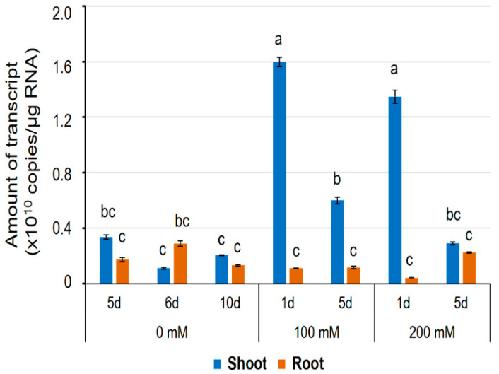 Figure 7. The expression level of the HvPIP2;8 transcripts in a barley cultivar, Haruna-Nijo, detected by qPCR. Five-day-old barley seedlings were prepared by hydroponic culture and further grown on the culture solution with or without NaCl (100 mM or 200 mM) for 1 day or 5 days. Transcript levels of HvPIP2;8 in shoots and roots were investigated by absolute quantification. Absolute amounts of transcripts (copies/µg RNA) were displayed. Significant differences (p < 0.05) are indicated by different letters using one-way ANOVA with Duncan’s multiple comparisons test. Data are the means ± SE, and n = 3.
