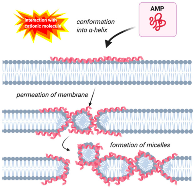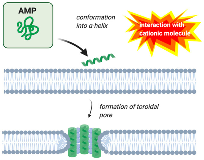 Figure 2. Membrane permeation by the toroidal pore model. AMPs are indicated by green helices. Image created with BioRender.com.
