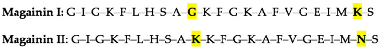 Figure 3. Amino acid sequence of magainin I and magainin II [36]. Two locations of mismatched amino acids on the peptide sequence are highlighted in yellow.