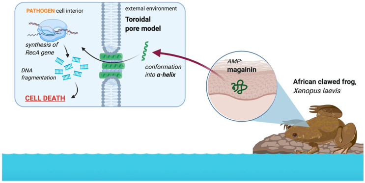 Figure 5. Role of the AMP magainin in the African clawed frog in the defense against amphibian pathogens. The peptide is located in the dermis of the African clawed frog skin and conforms into an alpha helix upon interacting with a negatively charged membrane, resulting in the formation of toroidal pores in most instances. The peptide interferes with internal metabolic processes by activating the RecA gene, which causes DNA fragmentation [41]. This ultimately kills the pathogen. Image created with BioRender.com.