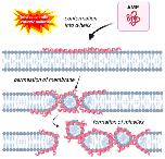Figure 1. Membrane permeation by the carpet model. Antimicrobial peptides (AMPs) are indicated by pink helices. Image created with BioRender.com.