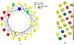 Figure 4. Helical wheel (a) and net diagrams (b) of magainin I [42]. Amino acids are indicated by their single-letter abbreviations and are categorized according to the following colors: polar basic (red), polar acidic (blue), polar uncharged (green), nonpolar (yellow). Both the wheel and net diagrams demonstrate the division of hydrophobic and hydrophilic components of the peptide. The helical wheel diagram was generated using online software called NetWheels [43] and the net diagram was made using Microsoft PowerPoint.