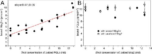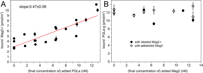 Figure 1. (A) Surface concentration (pmol/m2) of bilayer-associated red particles (i.e. diffusing particles of Mag2-r) as a function of the solution concentration (nM) of unlabeled PGLa. The Mag2-r concentration in solution is (approximately) constant at 13 nM. (B) Surface concentration (pmol/m2) of bilayer-associated green particles (i.e. diffusing particles of PGLa-g) as a function of the solution concentration (nM) of magainin 2 (labeled or unlabeled). The PGLa-g concentration in solution is (approximately) constant at 13 nM. Experiments were performed at 24 °C.