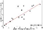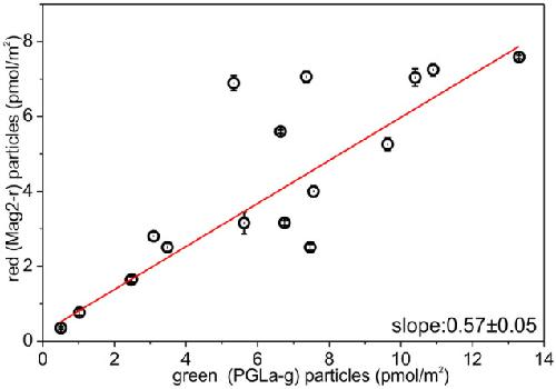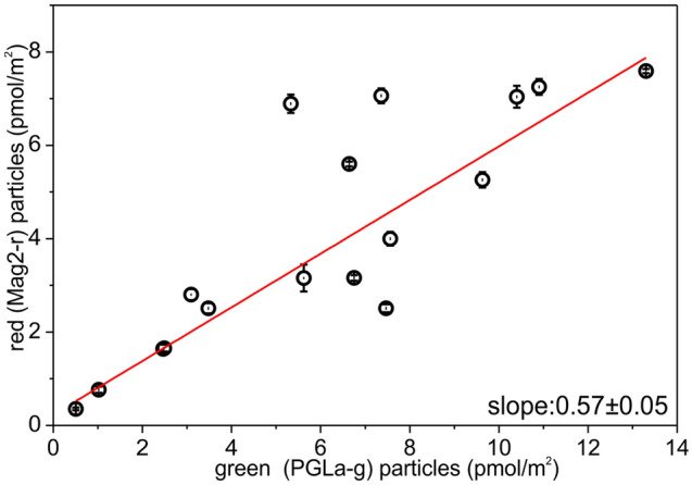Figure 2. Surface concentration (pmol/m2) of red particles (i.e. diffusing Mag2-r particles) associated with GUVs made from POPE/POPG 2/1 mol/mol as a function of the surface concentration of bilayer-associated green particles (i.e. diffusing PGLa-g particles), during the titration of Mag2-r (concentration in solution 13 nM) with PGLa-g. Experiments were performed at 24 °C.