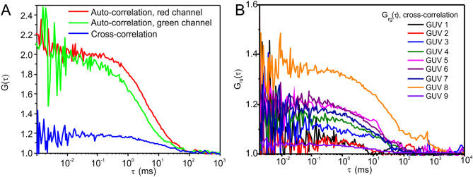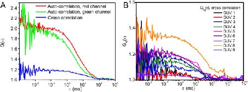 Figure 3. (A) Typical auto- and cross-correlation functions, G(τ), and (B) cross-correlation functions, Grg(τ), from 1:1 mixtures of PGLa-g and Mag2-r solutions (13 nM) in the presence of 58 µM POPE/POPG (2/1 mol/mol) in the form of GUVs. Experiments were performed at 24 °C.