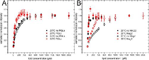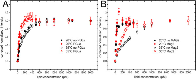 Figure 4. Dilution corrected and normalized intensity of (A) 10 µM magainin 2 in the presence (red) or absence (black) of 10 µM PGLa and (B) 10 µM PGLa in the presence (red) or absence (black) of 10 µM magainin 2 at 20 °C (closed symbols) or 35 °C (open symbols) for increasing lipid concentrations (POPE/POPG, 3/1 mol/mol).