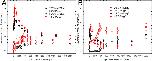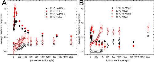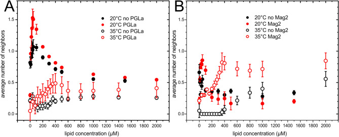 Figure 5. Average number of neighbors of (A) 10 µM magainin 2 in the presence (red symbols) or absence of 10 µM PGLa (black symbols) and (B) of PGLa in the presence (red symbols) or absence of magainin 2 (black symbols) for increasing amounts of lipid (POPE/POPG, 3/1 mol/mol). Measurements were performed at 20 °C (closed symbols) or 35 °C (open symbols).