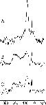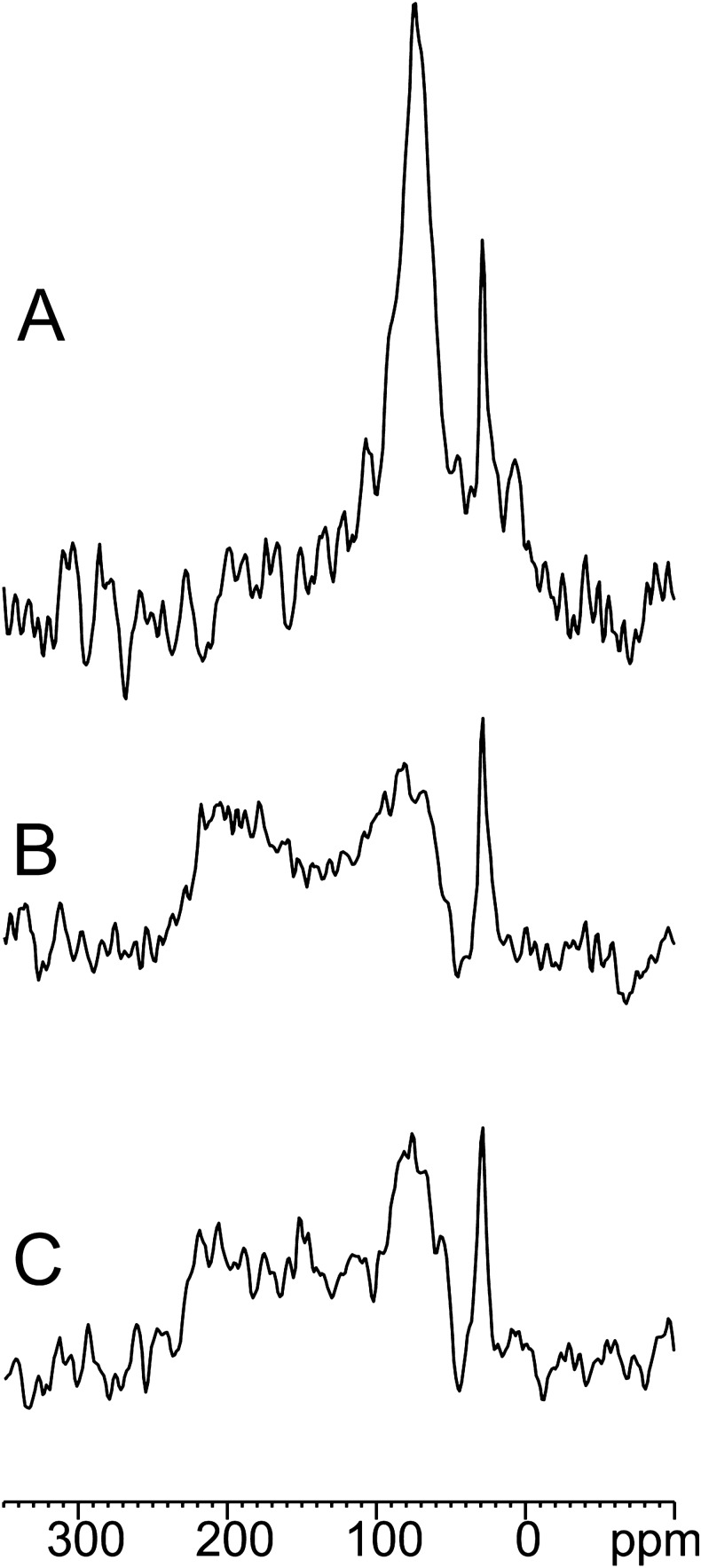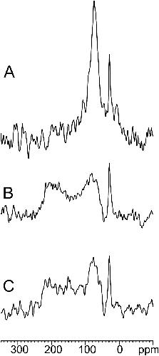 Figure 7. 15N solid-state NMR spectra of [15N-Ala14]-PGLa (2% P/L ratio) reconstituted into POPE/POPG 3/1 (mol/mol) bilayers uniaxially oriented with the normal parallel to the magnetic field direction of the NMR spectrometer and in the presence of an equimolar amount of unlabeled magainin 2 at 35 °C (A), 20 °C (B) and 5 °C (C).