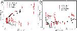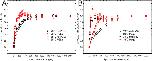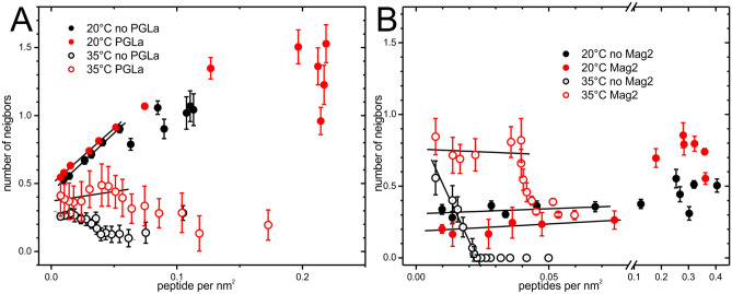 Figure 6. A. Average number of neighbors of 10 µM magainin 2 in presence (red symbols) or absence of 10 µM PGLa (black symbols). B. Average number of neighbors of 10 µM PGLa in presence (red symbols) or absence of 10 µM magainin 2 (black symbols). The lines correspond to linear fits below 0.05 peptides per nm2 of lipid surface. Measurements were performed at 20 °C (closed symbols) or 35 °C (open symbols).