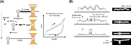 Figure 1. Single-molecule techniques to investigate chromosome organisation(A) An optical trap measuring forces involved in chromatinisation of λ DNA in Xenopus egg extracts [6]. λ DNA attached to beads at both ends is bound at one end to a micropipette, then incubated in extracts to form chromatin. After chromatin assembly, extract is replaced with buffer and the second bead optically trapped. The micropipette is moved away from the optical trap, and force in DNA fibre is continuously measured, shown here in the force extension curve. (B) Adding nucleosome-depleted egg extracts to λ DNA double-tethered to the surface of a coverslip allows loop extrusion to occur. Loops appear as regions of high SYTOX staining on DNA, visualised by TIRF microscopy, unless applying perpendicular flow [15]. Abbreviation: TIRF, total internal reflection fluorescence.