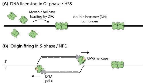 Figure 2. DNA replication in X. laevis extracts(A) During G1-phase, DNA is licensed at origins of replication. The ORC, Cdc6 and Cdt1 load Mcm2-7 helicases as inactive DH complexes around dsDNA. HSS extracts license DNAs with DHs, with ORC in HSS binding DNA in a sequence-independent manner, so specific origins are not required and different DNAs can be licensed in HSS [51]. (B) In S-phase, a number of essential firing factors initiate DNA replication. Mcm2-7 from DHs is remodelled into the CMG helicase which binds ssDNA and unwinds DNA in the 3â²-to-5â² direction. Other replisome components assemble around CMG [52]. The events of origin firing are recapitulated by adding NPE to DNAs licensed in HSS.