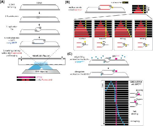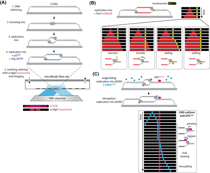 Figure 3. Single-molecule techniques to study DNA replication in extracts(A) λ DNA can be replicated in a microfluidic flow cell using a licensing mix, containing HSS, followed by a replication mix, containing HSS and NPE. Adding a second replication mix containing the CDK inhibitor p27kip prevents excessive origin firing. Digoxigenin-dUTP labels nascent DNA, which can be immunostained [22]. (B) Real-time imaging of replication forks in extracts with Fen1-mKikGR, which binds nascent DNA [25], and adaptation of this system to visualise the fate of labelled nucleosomes reconstituted on λ DNA [26]. The righthand panel shows a kymogram, a stack of images from a single position of interest, with a growing replication bubble marked by Fen1-mKikGR. After the righthand replication fork reaches the labelled nucleosome four different histone fates are observed. (C) Summary of the KERHMIT assay developed in [33]. The bottom panel shows an example kymogram, where the righthand replication fork collides with a stable leading strand DPC. After initial pausing at the DPC, CMG is shown to bypass the DPC, with the fork rate slowing down until possible recoupling to polymerase. Abbreviation: DPC, DNAâprotein cross-link.