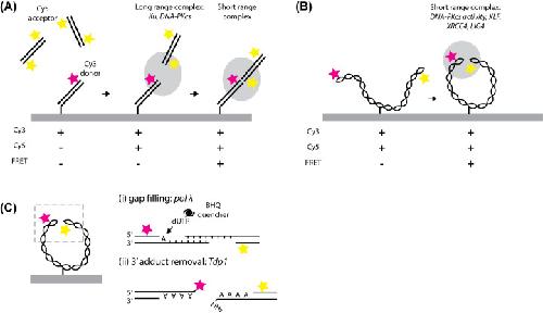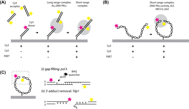 Figure 4. Studying the mechanism of NHEJ by smFRET(A) Intermolecular end joining assay for monitoring NHEJ in HSS. The Cy3 donor fluorophore is attached to a 100-bp DNA on the surface of a coverslip inside a microfluidic flow cell. Cy5 association with Cy3 with no FRET shows long range complex formation, followed by conversion into short range complexes, where FRET between the fluorophore pair occurs [40]. (B) Intramolecular end joining assay, where Cy3 and Cy5 fluorophores are at the ends of a DNA fragment bound to the surface with an internal biotin [40]. Cy3 and Cy5 continuously are present in a diffraction-limited spot but only show FRET when a short-range complex forms. (C) Modifications to intramolecular end joining assays for monitoring enzymatic processing of non-compatible DNA ends [42]. (i) pol λ fills gaps in substrates with resected 3ⲠDNA ends, detected here by incorporation of a nucleotide modified with BHQ, which quenches Cy3 fluorescence. (ii) Tdp1 removes adducts on 3ⲠDNA ends, in this example removing Cy3 modification at one 3ⲠDNA end.