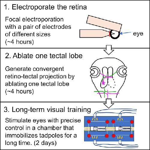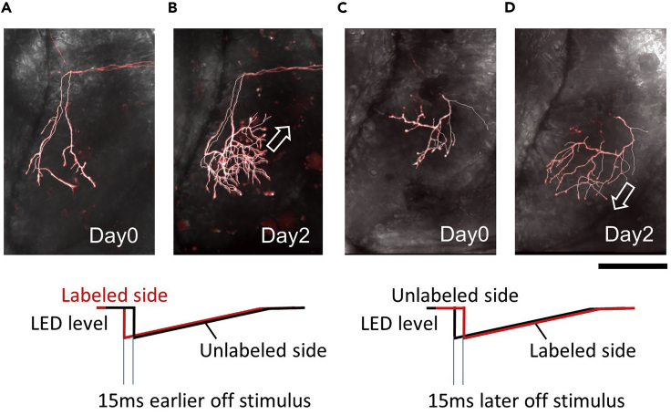 Figure 7. In vivo images of retinotectal axon arbors collected over a 2-day intervalThe left eye was stimulated 15 ms earlier (A and B) or later (C and D) than the right eye. The cell body of the labeled RGC is in the left eye. DIC images of the tectum are superimposed. Day 0: start of visual stimulation. Two RGCs are labeled in the left panels. Scale bar, 100 μm. From Hiromoto and Cline (2020). The diagrams show the intensity of the LEDs during the visual stimulation. One cycle of the stimulus is 11 s. The visual stimulation continued for 10 h per day. The RGCs that were stimulated earlier and later developed their arbors in the rostral and caudal direction, respectively.