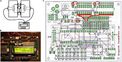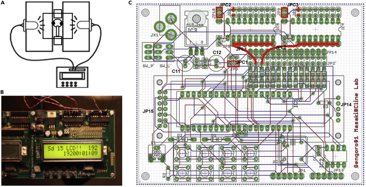 Figure 2. Visual stimulation controller(A) A diagram of the visual stimulation setup. A controller (lower) is connected to LEDs on the plates that holds the animals (upper).(B) The visual stimulation controller in operation.(C) The pattern of the circuit board. The parts are soldered to the board. The electric parts are described in the Key resources table. Jumper lines (red) need to be soldered to the custom-ordered circuit board by users.