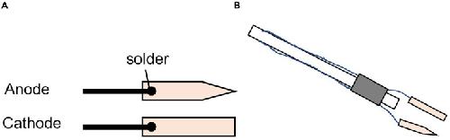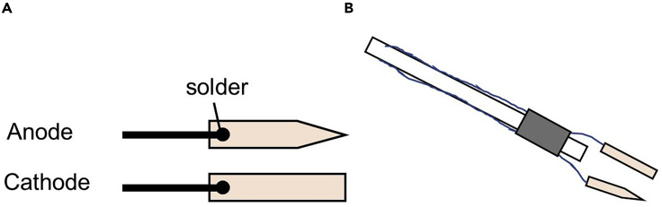 Figure 3. Electrodes for electroporation(A) Design of the platinum electrode for electroporation. The anode is cut to a point for focal contact with the back of the eye and the cathode is larger for greater contact area with the front of the eye. The platinum plates are soldered to wire that is thick enough to hold the electrodes.(B) The wires are attached to a 3 mm rod with a heat-shrink tubing (gray).