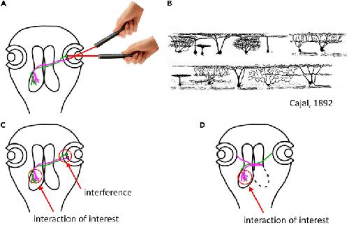 Retinal ganglion cells (RGCs) on a retina cannot be stimulated independently. (A) Cartoon showing an attempt to stimulate two RGCs on a retina. (B) Drawing of retinal ganglion cells in frog (Cajal, 1972). RGCs extend dendrite over wide area in the retina. This induces unintended interaction of the two visual inputs within the retina. (C and D) To control visually driven activity in convergent RGCs, animals in which one tectal lobe is ablated are used, so both eyes innervate the remaining optic tectum. Each eye can be stimulated independently. The green and pink traces are activity in the tectal cells evoked by the green and pink retinal ganglion cells, respectively.