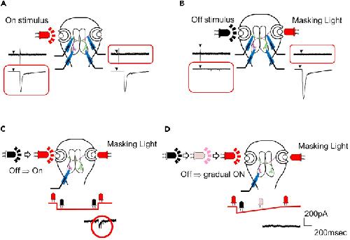 (C) For repeated presentation of OFF stimuli, the LED has to be turned on for the next OFF stimulation; however even a stepwise increase in light intensity can indirectly stimulate the other eye (red circle).