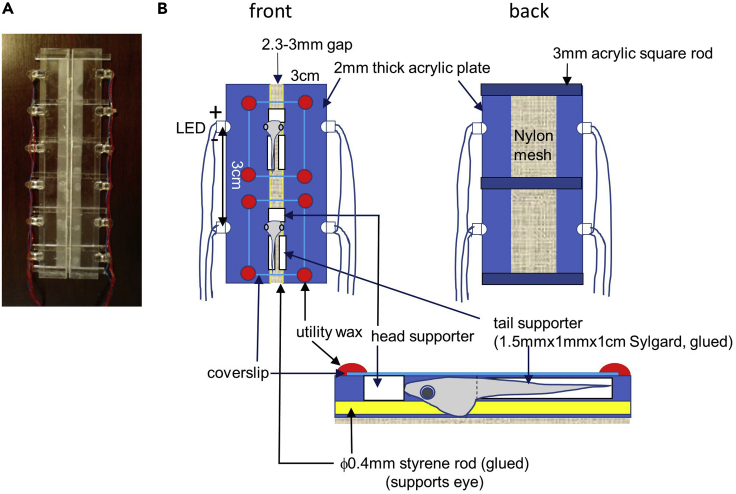 Figure 1. A chamber for visual stimulationTop view photo (A) and schematic drawings of the chamber and components (B). The chamber holds six tadpoles between the two acrylic plates that are 2 mm thick × 3 cm wide. There is a gap between the two plates of 2.3–3 mm where the tadpoles are positioned. A strip of mesh is glued under the gap of the two plates with acrylic glue and forms a sling under the tadpoles. Six rectangular rods are glued under the acrylic plates. The animal is held snugly in the chamber as follows: the ventrolateral sides of the head are supported by 0.4 mm styrene rods or strips of Sylgard glued to the lower edge of the acrylic plates. The head is supported by a Sylgard block positioned in front of the head. It is held in place by the acrylic plates on either side and the coverslip laid over the animal. The tail is supported on both sides by two strips of Sylgard glued to the painted inner edge of the acrylic plates. LEDs are positioned on each side of the chamber at eye level for the tadpoles. LEDs are glued to the acrylic plates with epoxy glue. Before mounting the LEDs on the chamber, a slit is cut in the plastic dome on top of the LED which provides more even illumination to the eye. Wires are soldered to LEDs. Either the anodes or the cathodes are connected to a common line. The other terminals are connected to the power source independently through resistors. Tadpoles are inserted in the slit. The head supporter is positioned to immobilize the tadpoles. Cover slips are overlaid on the tadpoles and attached to the acrylic plates using utility wax.