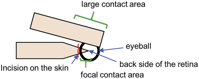 An incision (red line) is made in the skin to insert the anode to contact the back of the eye. The cathode is placed on the skin in front of the eye to make a large contact area. Electroporate immediately after injecting the DNA solution. Make sure that the DNA solution is retained between the retina and the lens before electroporation.