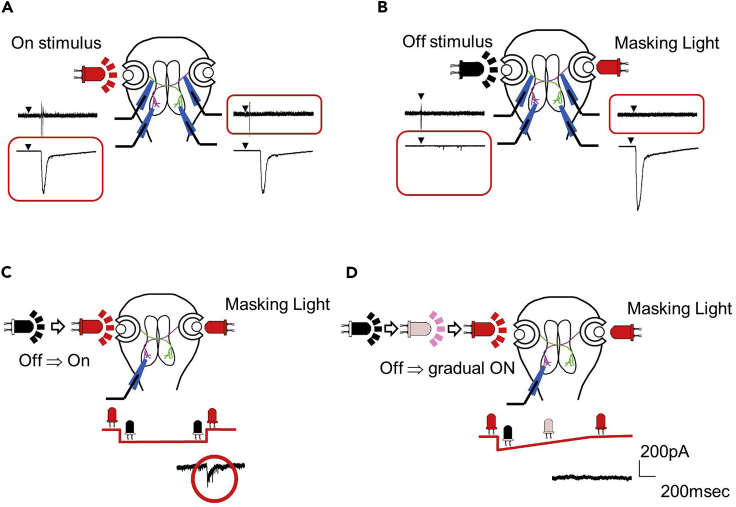 Figure 6. Strategy to stimulate one eye(A) Unilateral visual stimulation activates both eyes. Electrophysiological recordings from the left and right optic nerves and whole cell recording from neurons in the left and right optic tecta show responses in the retinal ganglion cell axons and the tectal cells respectively following unilateral visual stimulation (red LED and lines indicate visual stimulus). In tadpoles each eye projects axons primarily to the contralateral optic tectum. Stimulus timing is indicated with arrowheads. The light presented to one eye stimulates both eyes due to scattering and reflection.(B) Masking light presented to one eye (red) prevents the indirect activation of the eye receiving the masking light and results in unilateral responses to the eye receiving the direct visual stimulation (black LED and lines indicate OFF visual stimulation).(C) For repeated presentation of OFF stimuli, the LED has to be turned on for the next OFF stimulation; however even a stepwise increase in light intensity can indirectly stimulate the other eye (red circle).(D) Gradually increasing LED intensity prevents the unintended indirect stimulation of the eye. In this example, the ramp of increased intensity was 11 s long. The recordings were collected in voltage clamp mode at −70 mV.