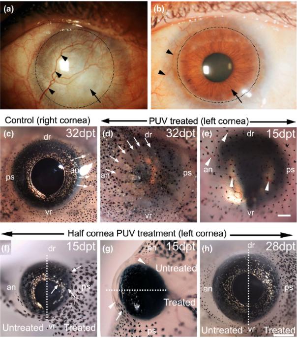 FIGURE 1 Limbal stem sell deficiency and stem cell transplantation in humans, and stem cell deficiency and corneal restoration in Xenopus.(a) Example of a human cornea with total limbal stem cell deficiency after receiving a chemical burn with involvement of the corneal stroma.Corneal opacification (black arrows) and neovascularization (black arrowheads) is apparent. (b) Example of another patient who received acultivated autologous limbal stem-cell graft, and penetrating keratoplasty (in some cases, this secondary corneal transplant from an allogeniccornea is necessary for improving visual acuity), showing successful restoration of a transparent corneal epithelium (black arrow). Vascularizationis now restricted to the conjunctiva (black arrowheads). Dotted black circle outlines the cornea region. (câe) PUV treatment model of stem celldeficiency in Xenopus recapitulates the hallmarks of human limbal stem cell deficiency. (c) Control frog cornea depicting normal transparentmorphology. The cornea is free of vasculature, pigment cells, and the lateral line organs (white arrows) are restricted to the surrounding skin.(d) PUV treated cornea at 32 days post treatment (dpt), depicting the loss of transparency. The cornea is covered with epidermal tissue similar tothat surrounding the eye. Skin cells, including pigment cells, and the lateral line organs (white arrows), have invaded the corneal region. Note linesof melanophores between the lateral line organs. (e) Younger PUV treated case at 15dpt, depicting vascularization with multiple blood vesselspassing into the cornea (white arrowheads). (fâh) PUV treatment localized to one half of the Xenopus cornea is eventually restored. (f) At 15 dayspost PUV treatment, the treated half shows opacity and increased pigmentation (white arrows), whereas the untreated half is devoid of pigmentcells and remains transparent. (g) Dorsal view of the specimen shown in (f) shows neovascularization (white arrowheads), and increasedpigmentation (white arrows). (h) At 28 days post PUV treatment, the treated half of the cornea has been restored. It is now transparent and freefrom pigment cells. an, anterior side; dr, dorsal side; ps, posterior side; vr, ventral side. Scale bar in (e) equals 665 îm for (c,d), and 200 îm for (e).Scale bar in (h) equals 500 îm for (fâh). Image in (a) is from Sacchetti et al. (2018), Limbal Stem Cell Transplantation: Clinical Results, Limits, andPerspectives, Copyright © (2018), open access article distributed under the Creative Commons Attribution 4.0 International License (http://creativecommons.org/licenses/by/4.0/). Image in (b) is from Paolo, R., Matuska, S., Paganoni, G., et al. Limbal stem-cell therapy and long-termcorneal regeneration, The New England Journal of Medicine, 363(2), 147â155. Copyright © (2010) Massachusetts Medical Society, Reprinted withpermission from Massachusetts Medical Society. Images in (c,eâh) are reprinted from Adil, M. T., Simons, C. M., Sonam, S., Henry, J. J.Understanding cornea homeostasis and wound healing using a novel model of stem cell deficiency in Xenopus, Experimental Eye Research, 187,107767. Copyright (2019), with permission from Elsevier