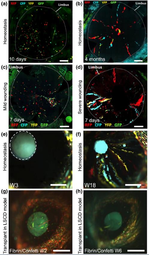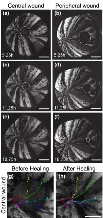 IGURE 2 Wound healing and cell tracking in the mousePAX6-GFP model. (a,c,e) Images from time-lapse confocal microscopyshowing healing of a 1 mm diameter central wound in a PAX6-GFPmosaic corneal epithelium (the white areas are GFP-positive). Thewound completely closes by 18.75 hr (h) after wounding. (b,d,f)Healing of a peripheral wound showing closure and the formation of asecondary whorling pattern. By 18.75 hr this wound has not closedcompletely. Dotted circles show the extent of the wounds. (g,h) Highmagnification views and graphical representation detail the healing ofa central wound in a PAX6-GFP cornea. (g) View of the initial 1 mmwound and the future routes taken by tracked cell stripes (numbered1â6). (h) After 18 hr of healing the wound is completely closed, butthe stripes do not meet at the center of the original wound, and donot extend equally. Scale bars in (a)â(f) equal approximately 1 mm.Scale bar in H equals 500 îm and applies to (g) and (h). Images arefrom Mort et al. (2009), Mosaic analysis of stem cell function andwound healing in the mouse corneal epithelium, Copyright © 2009,Mort et al; licensee BioMed Central Ltd., open access articledistributed under the Creative Commons Attribution 4.0 InternationalLicense 4.0 (http://creativecommons.org/licenses/by/4.0/)