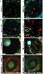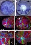 FIGURE 3 Lineage tracing in mice and zebrafish corneas. (a,b) Lineage tracing in CAGG driven LacZ mice. Eyes were stained for β-gal activityafter a 5 week (wk) chase period. (a) shows small β-gal positive patches throughout the cornea and conjunctiva. (b) After a 14 week chase periodstripes extend radially toward the center of the cornea. (câg) Long-term clonal analyses in the zebrafish cornea expressing the âZebrabowâconstruct. Recombination was induced at 6â12 hr post fertilization for expression of different fluorescent proteins, and images taken at the timepoints indicated. (c,d) Corneal clones at 10 and 15 days post fertilization (dpf). (e,e0) High magnification views near the periphery of the corneataken from (c) and (d), respectively. Labeled cornea clones near the periphery become scattered and interspersed by smaller cell clones. (f,f0) Highmagnification views near the center of the cornea taken from (c) and (d), respectively. Rosette-like structures are seen in the central cornea(compare f with f0, circle marks a rosette). (f00) Optical cross-section at the center of the rosette shown in (f0). A single blue cell has been extrudedfrom the corneal surface (arrowhead). (g) Example of well-established wedge-shaped clones in an older juvenile fish. Scale bar in (a) equals 0.5 mmfor (a,b). Scale bars equal 100 îm in (c,d); 50 îm in (e,e0,f,f0,f00); 200 îm in (g). Images in (a,b) are from Dora et al. (2015), Lineage tracing in theadult mouse corneal epithelium supports the limbal epithelial stem cell hypothesis with intermittent periods of stem cell quiescence, Copyright ©2015, Dora et al., published by Elsevier, open access article distributed under the Creative Commons Attribution License 4.0 (http://creativecommons.org/licenses/by/4.0/). Images in (câg) are from Pan et al. (2013), and reproduced with permission from Development, Copyright© (2013), The Company of Biologists Ltd