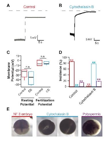 Figure 1 : Representative whole-cell recordings made during fertilization in control conditions (A) or 10 µg/ml cytochalasin B (B). Grey dashed lines denote 0 mV. Tukey box plot distributions of the resting (n = 10) and fertilization (n = 4) potentials (C). (D) Average percentage (± s.e.m.) of embryos inseminated under control conditions (red) or with 10 µg/ml cytochalasin B (blue), that developed normally to the 4-cell (NF 3) stage, with incomplete cytokinesis, or with abnormal cleavage furrows (n = 14), colors correspond to images shown in E. (E) Representative images of a NF 3 embryo, two cytochalasin B treated embryos with incomplete cytokinesis and a polyspermic embryo with abnormal cleavage furrows. *** denotes P < 0.001 and n.s denotes a P > 0.05 as determined by Studentâs t-tests with the Bonferroni correction.