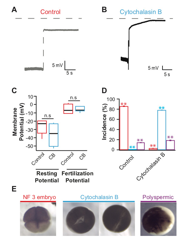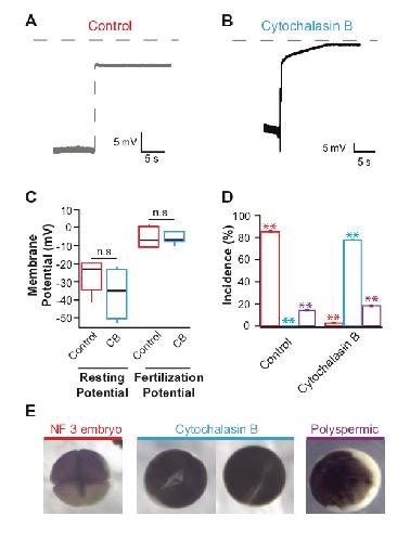 Figure 1. Representative whole-cell recordings made during fertilization in control conditions (A) or 10 µg/ml cytochalasin B (B). Grey dashed lines denote 0 mV. Tukey box plot distributions of the resting (n = 10) and fertilization (n = 4) potentials (C). (D) Average percentage (± s.e.m.) of embryos inseminated under control conditions (red) or with 10 µg/ml cytochalasin B (blue), that developed normally to the 4-cell (NF 3) stage, with incomplete cytokinesis, or with abnormal cleavage furrows (n = 14), colors correspond to images shown in E. (E) Representative images of a NF 3 embryo, two cytochalasin B treated embryos with incomplete cytokinesis and a polyspermic embryo with abnormal cleavage furrows. *** denotes P < 0.001 and n.s denotes a P > 0.05 as determined by Student’s t-tests with the Bonferroni correction.