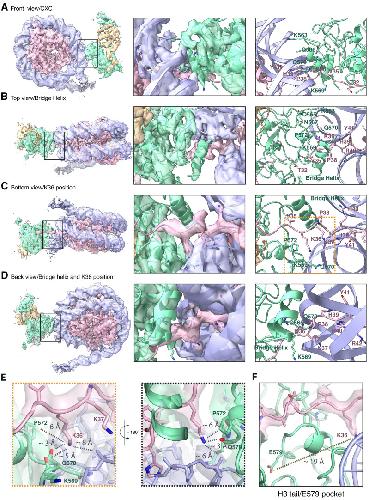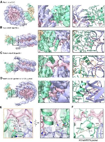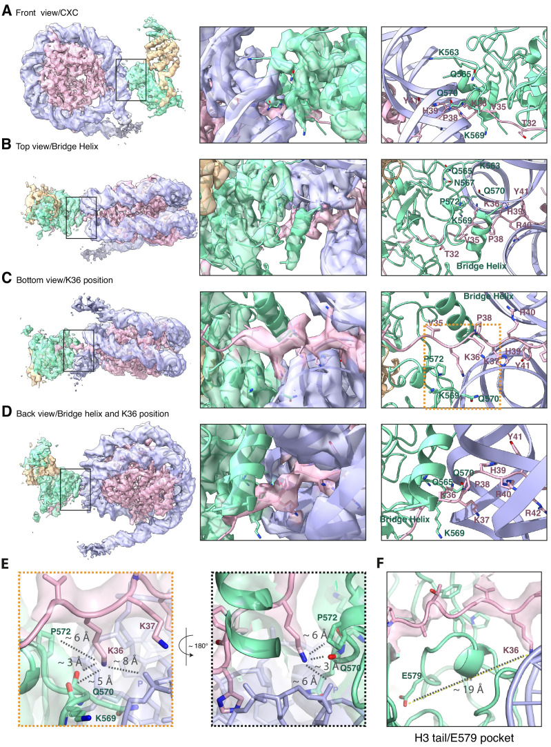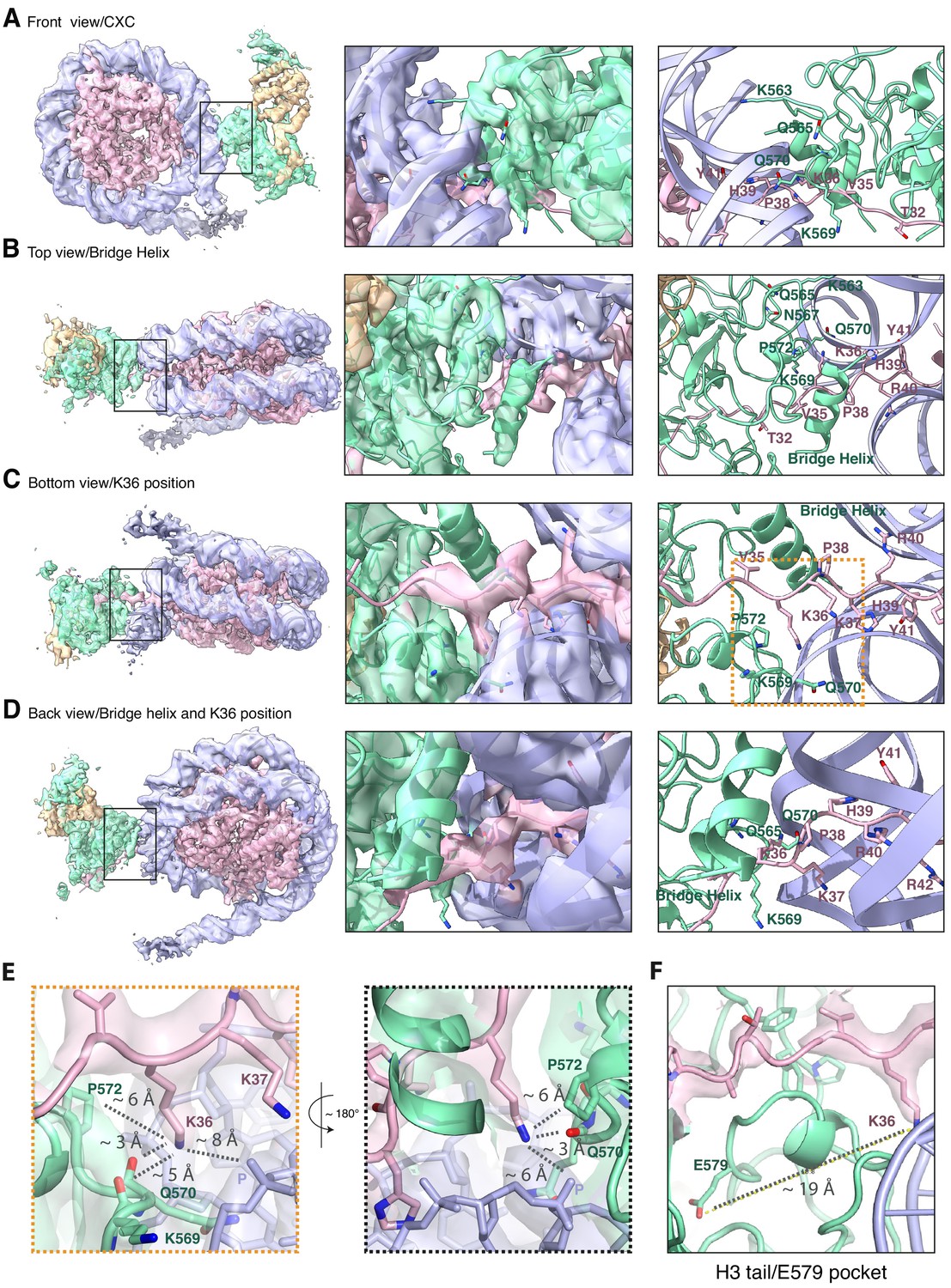 Figure 1—figure supplement 4 The improved map of the interaction between EZH2 and the substrate nucleosome after focused refinement reveals location of H3K36 and its environment (related to Figure 1). (A) The front view of EZH2sub-Nucsub cryo-EM density and model shows details of the EZH2CXC interaction with nucleosomal DNA. (B) The top view of EZH2sub-Nucsub cryo-EM shows a tubular density into which based on recent findings of the Nogales lab ( Kasinath et al., 2020 ) an α-helix was built. The "bridge helix" (Kasinath et al., 2020) which based on this study is likely constituted of the EZH2 residues 497–511, is located above V35 of the H3 tail. As can be seen when observing the density-modified map (Terwilliger et al., 2020) of EZH2sub-Nucsub at lower threshold, it presumably engages in interactions with the nucleosomal DNA, the H3 tail and EZH2, as described in greater detail in Kasinath et al., 2020. (C) The bottom view of EZH2sub-Nucsub cryo-EM density and model shows details of the vicinity of K36 with the corresponding density for the H3 tail, EZH2 and nucleosomal DNA. The orange square indicates the region shown as a zoom-in in (E). (D) The back view of EZH2sub-Nucsub cryo-EM density and model shows details of the location of K36 and the "bridge helix" (Kasinath et al., 2020 ). (E) Zoom-in views of H3K36 and its chemical environment. Approximate distances of the epsilon-amino group of H3K36 to the nearest residues are indicated with a dotted gray line. (F) Location of the Glu-579 pocket (Jani et al., 2019) in the EZH2sub:Nucsub reconstruction and its distance to H3K36 (app. 19 Å). The described mechanism by Jani et al., 2019 involving recognition of H3K36 by Glu-579 is incompatible with the presented structural data as the location differs significantly and major rearrangements as the relocation of the helix-loop region between residues 564–576 would be necessary to avoid the given steric and geometric hindrance and allow for potential interaction. |