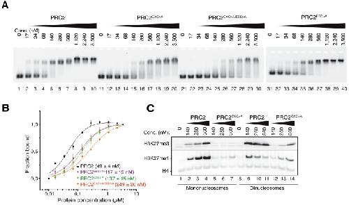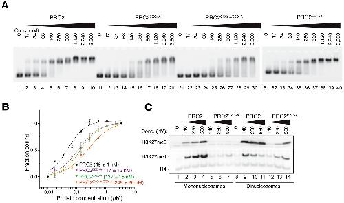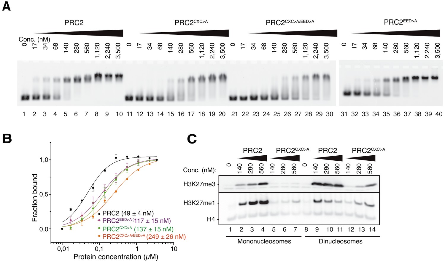 Figure 2. The EZH2CXC-DNA interaction interface is critical for H3K27 methylation on nucleosomes.(A) Binding reactions with indicated concentrations of PRC2 (lanes 1–10), PRC2CXC>A (lanes 11–20), PRC2CXC>A/EED>A (lanes 21–30), or PRC2EED>A (lanes 31–40) and 45 nM 6-carboxyfluorescein-labeled mononucleosomes, analyzed by EMSA on 1.2% agarose gels. The EMSA with PRC2EED>A was run on a separate gel. (B) Quantitative analysis of EMSA data in A by densitometry of 6-carboxyfluorescein signals from independent experiments (n = 3); error bars, SEM. (C) Western Blot (WB) analysis of H3K27me1 and H3K27me3 formation in HMTase reactions with indicated concentrations of PRC2 and PRC2CXC>A on 446 nM mononucleosomes (lanes 1–7) or 223 nM dinucleosomes (lanes 8–14). Note that these concentrations result in equal numbers of nucleosomes and therefore equal numbers of H3 substrate molecules in the reactions on mono- and dinucleosomes, as can be seen from the Coomassie-stained gel of the reactions in Figure 2—figure supplement 1B. H4 WB signal served as control for western blot processing. |
