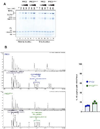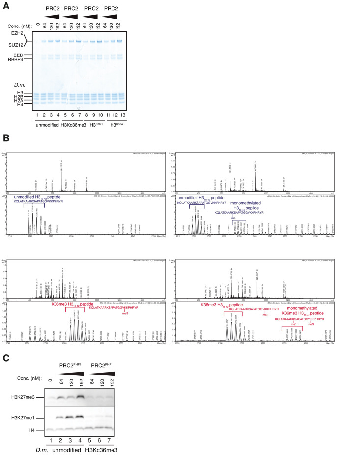 Figure 3—figure supplement 1. Accommodation of unmodified H3K36 in the EZH2CXC-DNA interaction interface is essential for H3K27 methylation on nucleosomes and PHF1-PRC2 (related to Figure 3).(A) Coomassie-stained 4–12% SDS-PAGE of the HMTase reactions shown in Figure 3C. Drosophila melanogaster (D.m.) nucleosomes were used for these experiments. The short 5 kDa PHFC fragment is not visible on this gel. (B) Full ESI MS spectra (upper part) and full deconvoluted MS spectra (lower part) shown for input peptides without PRC2 as a control (left) and with PRC2 (right) to ensure no overlapping between possible adduct peaks and monomethylation peaks. (C) Western blot (WB) analysis of HMTase reactions with full-length PHF1-PRC2 on unmodified (lanes 1–4) or H3Kc36me3 (lanes 5–7) mononucleosomes (446 nM). |