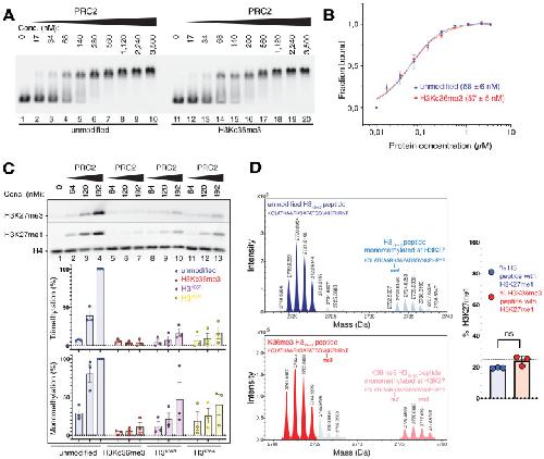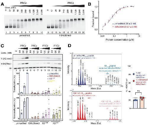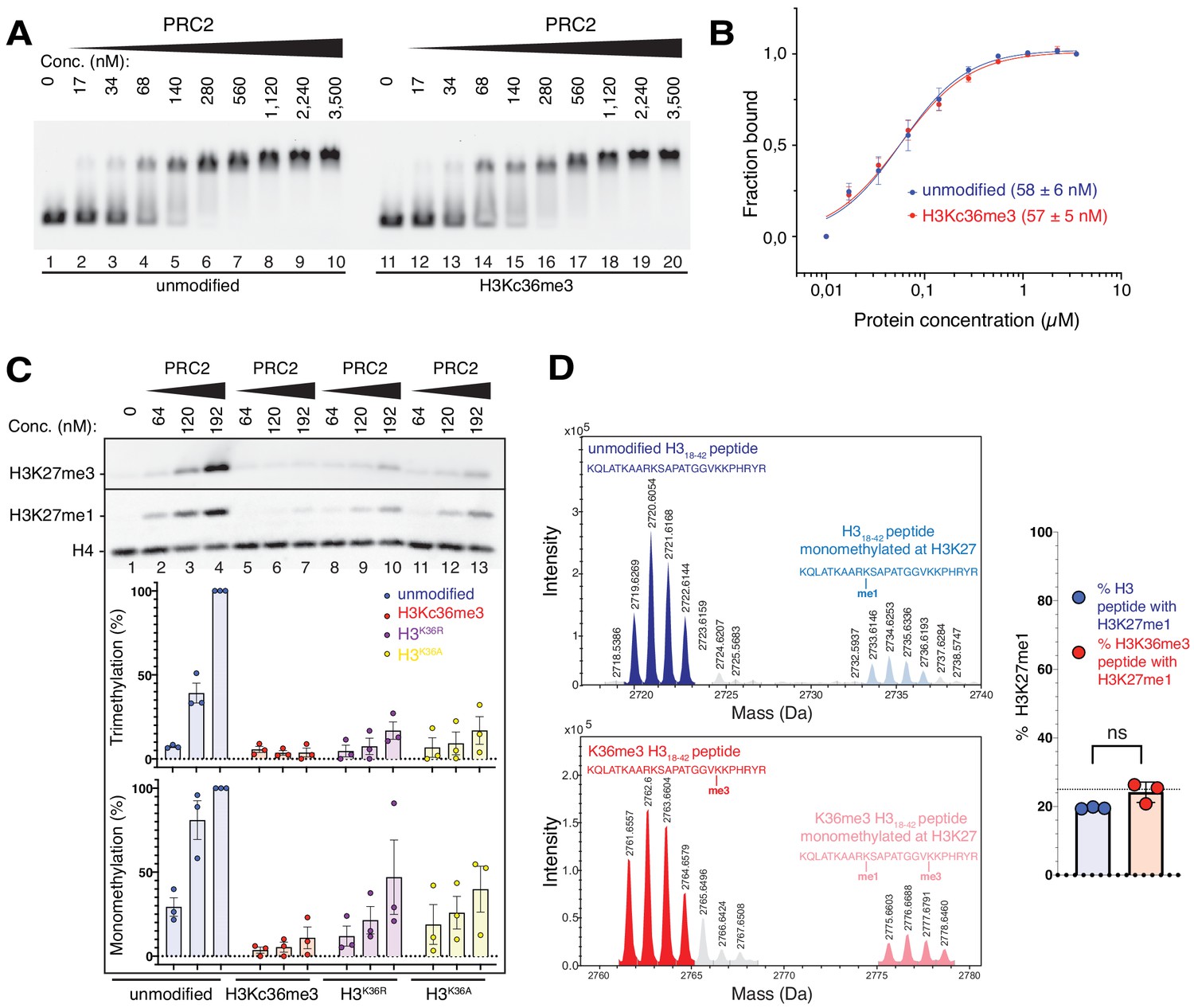 Figure 3. The unmodified H3K36 side chain in the EZH2CXC-DNA interaction interface is critical for H3K27 methylation on nucleosomes.(A, B) EMSA analysis and quantification as in Figure 2A and B, using PRC2 and mononucleosomes that were unmodified (lanes 1–10) or contained a trimethyllysine analog at H3K36 (H3Kc36me3, lanes 11–20) (Simon et al., 2007). (C) Western blot (WB) analysis of HMTase reactions with PRC2 as in Figure 2C on unmodified (lanes 1–4), H3Kc36me3 (lanes 5–7), H3K36R (lanes 8–10) or H3K36A (lanes 11–13) mononucleosomes (446 nM). Coomassie-stained gel of reactions is shown in Figure 3—figure supplement 1A. Bottom: quantification of H3K27me3 and H3K27me1 chemiluminescence signals, respectively, by densiometry analysis from three independent experiments. In each experiment, the methylation signal in lane four was defined as 100% and used to quantify the corresponding H3K27 methylation signals in the other lanes on the same membrane. Circles show individual data points and error bars SEM. (D) HMTase reactions monitoring H3K27me1 formation by PRC2 on H318-42 peptides that were unmodified (top) or contained K36me3 (bottom). Left: Deconvoluted ESI-MS spectra from data shown in Figure 3—figure supplement 1B. On both substrates, areas of the four colored peaks of H3K27me1-modified and unmodified substrate peptides were used for quantification of H3K27me1 formation. Right: Symbols represent percentages of peptides carrying H3K27me1 in technical triplicate experiments, error bars show SD; Welch’s t-test showed no significant (ns) difference between H3K27 monomethylation on the two peptide substrates. |