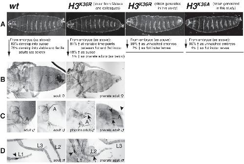 Figure 4. Drosophila with H3K36R or H3K36A mutant chromatin arrest development after completion of embryogenesis.(A) Ventral views of cuticles from wildtype (wt), H3K36R, or H3K36A mutant embryos. Note that the cuticle pattern of the mutant animals is indistinguishable from that of the wt embryo. Below: for each genotype, the fraction of embryos that developed into larvae, pupae, pharate adults or viable adults is listed. The fraction was determined by monitoring the development of collected hatched 1st instar larvae (wt: n = 300, H3K36R (Matera strain): n = 2000) or unhatched embryos (H3K36R (strain generated in this study): n = 200; H3K36A: n = 200). The GFP marker on the Balancer chromosomes was used for identifying H3K36R and H3K36A mutants. See Materials and methods for further information and discussion. (B) Dorsal views of the posterior portion of the thorax and of the abdomen. From 2000 hatched H3K36R mutant 1st instar larvae, a total of 18 pharate adults was recovered. Most H3K36R mutant pharate adults showed a relatively normal overall body patterning apart from the homeotic transformations illustrated below. (C) Frontal view of adult heads illustrating the antenna-to-leg transformation in H3K36R mutant pharate adults. The antenna-to-leg transformation in H3K36R mutant animals ranged from mild (arrows) to more extensive transformations with formation of leg-like structures such as in this extreme case (arrowheads). (D) The sex comb in males is normally only present on the protoracic (L1) legs (arrowheads). Among the H3K36R mutant pharate adult males recovered (n = 13), five showed one or several extra sex comb teeth (arrow) on the meso- (L2) or meta-thoracic (L3) legs. Extra sex comb teeth in adults are a hallmark phenotype of polycomb mutants. |