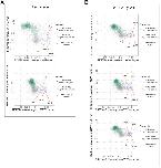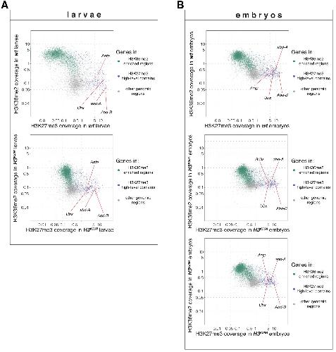 Figure 5—figure supplement 1. H3K36R and H3K36A mutants show altered H3K36me2 and H3K27me3 profiles (related to Figure 5).(A) Top, scatter plots showing H3K36me2 coverage in relation to H3K27me3 coverage in wt larvae. Green dots represent 9200 gene bodies overlapping with genomic intervals showing H3K36me2 enrichment, blue dots represent 1030 gene bodies overlapping with genomic intervals defined as high-level H3K27me3 domains (Bonnet et al., 2019), and gray dots represent 6300 gene bodies showing no enrichment for either methylation mark in larvae (see Materials and Methods). Bottom, scatter plot showing the H3K36me2 read coverage in relation to H3K27me3 read coverage in H3K36R mutant larvae. (B) As in (A) but showing H3K36me2 coverage in relation to H3K27me3 coverage in wt embryos (top), in H3K36A mutant embryos (middle) and in H3K36R mutant embryos (bottom). Green dots represent 10800 gene bodies overlapping with genomic intervals showing H3K36me2 enrichment, blue dots represent 1030 gene bodies overlapping with genomic intervals defined as high-level H3K27me3 domains (Bonnet et al., 2019), and gray dots represent 5400 gene bodies showing no enrichment for either methylation mark in embryos (see Materials and methods). |