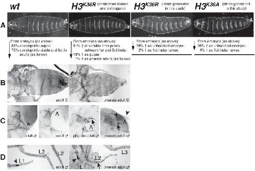 Figure 4 Drosophila with H3K36R or H3K36A mutant chromatin arrest development after completion of embryogenesis. (A) Ventral views of cuticles from wildtype (wt), H3K36R, or H3K36A mutant embryos. Note that the cuticle pattern of the mutant animals is indistinguishable from that of the wt embryo. Below: for each genotype, the fraction of embryos that developed into larvae, pupae, pharate adults or viable adults is listed. The fraction was determined by monitoring the development of collected hatched 1st instar larvae (wt: n = 300, H3K36R (Matera strain): n = 2000) or unhatched embryos (H3K36R (strain generated in this study): n = 200; H3K36A: n = 200). The GFP marker on the Balancer chromosomes was used for identifying H3K36R and H3K36A mutants. See Materials and methods for further information and discussion. (B) Dorsal views of the posterior portion of the thorax and of the abdomen. From 2000 hatched H3K36R mutant 1st instar larvae, a total of 18 pharate adults was recovered. Most H3K36R mutant pharate adults showed a relatively normal overall body patterning apart from the homeotic transformations illustrated below. (C) Frontal view of adult heads illustrating the antenna-to-leg transformation in H3K36R mutant pharate adults. The antenna-to-leg transformation in H3K36R mutant animals ranged from mild (arrows) to more extensive transformations with formation of leg-like structures such as in this extreme case (arrowheads). (D) The sex comb in males is normally only present on the protoracic (L1) legs (arrowheads). Among the H3K36R mutant pharate adult males recovered (n = 13), five showed one or several extra sex comb teeth (arrow) on the meso- (L2) or meta-thoracic (L3) legs. Extra sex comb teeth in adults are a hallmark phenotype of polycomb mutants. |