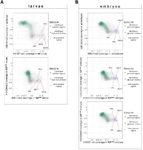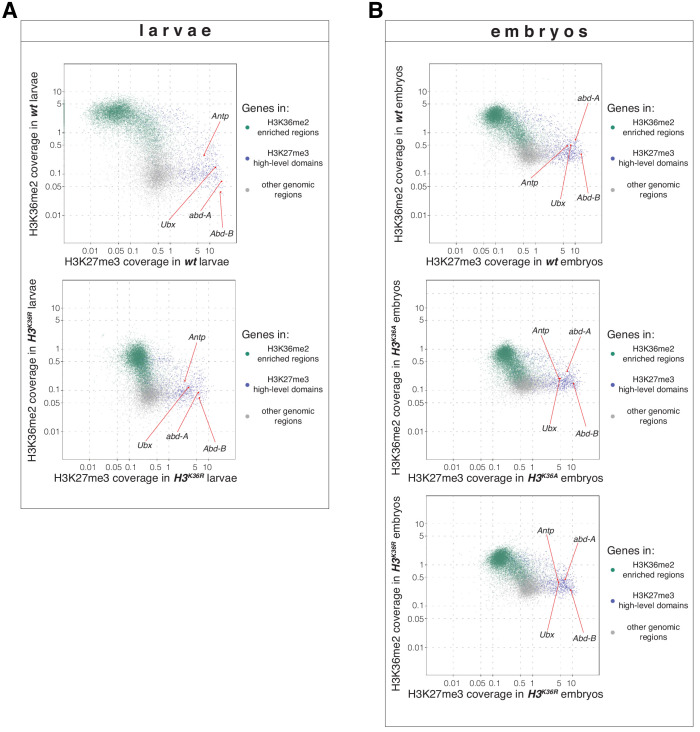 Figure 5—figure supplement 1 H3K36R and H3K36A mutants show altered H3K36me2 and H3K27me3 profiles (related to Figure 5). (A) Top, scatter plots showing H3K36me2 coverage in relation to H3K27me3 coverage in wt larvae. Green dots represent 9200 gene bodies overlapping with genomic intervals showing H3K36me2 enrichment, blue dots represent 1030 gene bodies overlapping with genomic intervals defined as high-level H3K27me3 domains (Bonnet et al., 2019), and gray dots represent 6300 gene bodies showing no enrichment for either methylation mark in larvae (see Materials and Methods). Bottom, scatter plot showing the H3K36me2 read coverage in relation to H3K27me3 read coverage in H3K36R mutant larvae. (B) As in (A) but showing H3K36me2 coverage in relation to H3K27me3 coverage in wt embryos (top), in H3K36A mutant embryos (middle) and in H3K36R mutant embryos (bottom). Green dots represent 10800 gene bodies overlapping with genomic intervals showing H3K36me2 enrichment, blue dots represent 1030 gene bodies overlapping with genomic intervals defined as high-level H3K27me3 domains (Bonnet et al., 2019), and gray dots represent 5400 gene bodies showing no enrichment for either methylation mark in embryos (see Materials and methods). |