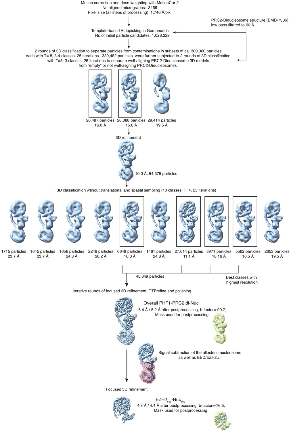 Figure 1—figure supplement 2. Overview of the cryo-EM Data-Processing and Particle Sorting Scheme (related to Figure 1).Processing and particle sorting scheme, also described in Methods. Squares indicate 3D classes (and corresponding particles) chosen for further processing steps based on their nominal global resolution values, translational and rotational accuracy and the presence of detailed structural information. Two final reconstructions were obtained in this study: Overall PHF1-PRC2:di-Nuc, and EZH2sub-Nucsub after performing signal subtraction (mask indicated in pink) and focused refinement. Masks used for postprocessing are shown in yellow. |