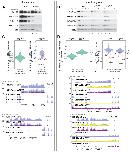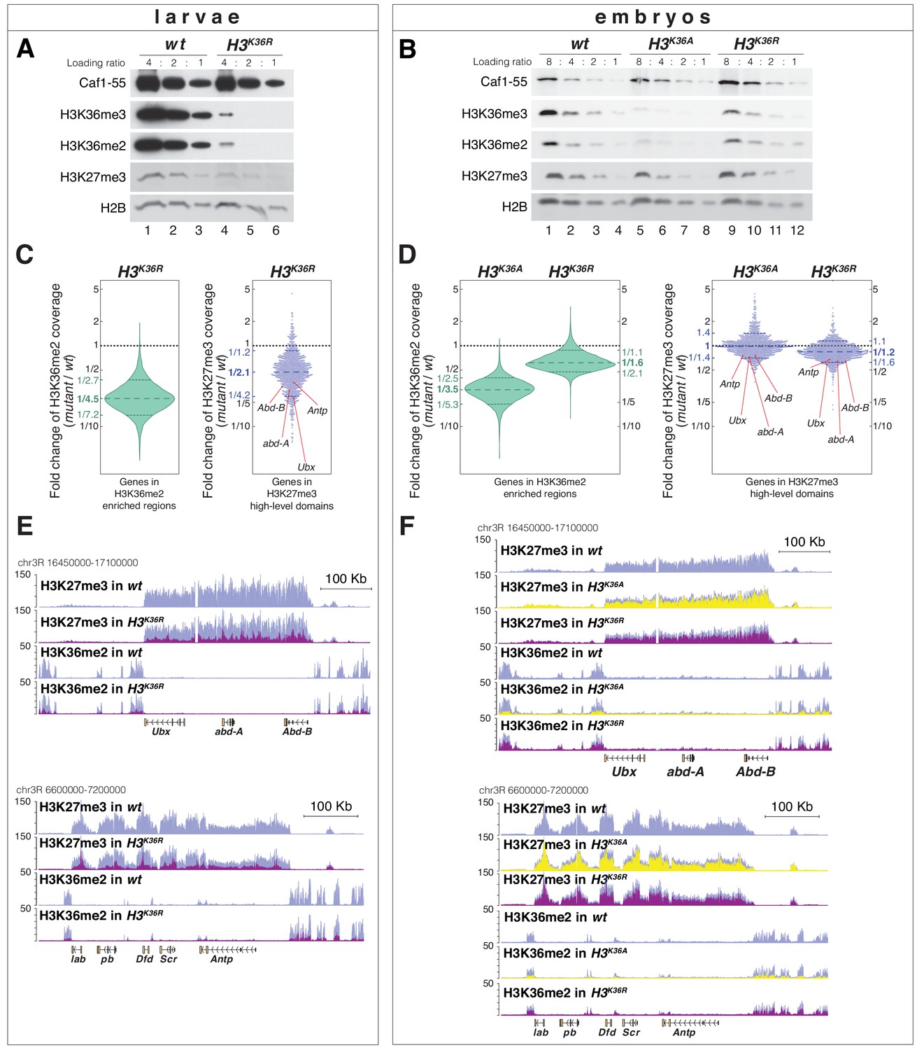 Figure 5. H3K36A and H3K36R mutants show reduced levels of H3K27me3.(A) Western blot analysis on serial dilutions (4:2:1) of total cell extracts from wing, haltere and 3rd leg imaginal disc tissues dissected from wildtype (wt, lanes 1–3) and H3K36R mutant (lanes 4–6) third instar larvae. Blots were probed with antibodies against H3K36me3, H3K36me2, or H3K27me3; in each case, probing of the same membranes with antibodies against Caf1-55 and H2B served as controls for loading and western blot processing. Note the reduced levels of H3K36me3 and H3K36me2 but also of H3K27me3 in H3K36R mutants compared to wildtype (wt) (see text). See Materials and Methods for details of all genotypes. (B) Western blot analysis on serial dilutions (8:4:2:1) of total nuclear extracts from 21 to 24 hr old wt (lanes 1–4), H3K36A mutant (lanes 5–8) and H3K36R mutant (lanes 9–12) embryos, probed with antibodies against H3K36me3, H3K36me2 or H3K27me3; and with antibodies against Caf1-55 and H2B as controls. Note that H3K36me3 and H3K36me2 levels are reduced in H3K36A mutants but not in H3K36R mutants where they are comparable to wt. Also note that H3K27me3 levels appear undiminished in either mutant (see text). (C) Left, violin plot showing the fold-change of H3K36me2 coverage in H3K36R mutant larvae relative to wt at genes that in wildtype larval CNS and imaginal disc tissues are decorated with H3K36me2 (see Materials and Methods). The dashed line marks the median reduction (4.5-fold), the dotted lines indicate the interval comprising 80% of regions. Right, Bee plot showing the fold-change of H3K27me3 coverage in H3K36R mutant larvae relative to wt at genes that in wildtype larval CNS and imaginal disc tissues are associated with high-level H3K27me3 regions (see Materials and Methods). The dashed line marks the median reduction (2.1-fold), the dotted lines indicate the interval comprising 80% of regions. Note that H3K27me3 coverage at the HOX genes abd-A, Abd-B, Ubx and Antp is between 3- and 4-fold reduced. (D) Analysis and representation as in (C) but showing fold-changes in H3K36me2 and H3K27me3 coverage in H3K36A and H3K36R mutant late-stage embryos relative to wt at genes that in wildtype embryos are decorated with H3K36me2 and H3K27me3, respectively. Note that H3K27me3 coverage at the HOX genes abd-A, Abd-B, Ubx and Antp is about 1.5-fold reduced. See also Figure 5—figure supplement 1. (E) H3K27me3 and H3K36me2 ChIP-seq profiles in larval CNS and imaginal disc tissues from wt (blue) and H3K36R mutant (purple) third instar larvae; in the tracks showing the profiles in the H3K36R mutant, the wt profile is superimposed as reference (see Supplementary file 2 and Materials and Methods for information about normalization). Top: genomic interval containing the Bithorax-Complex harboring the HOX genes Ubx, abd-A and Abd-B; bottom: genomic interval containing the Antennapedia-Complex with the HOX genes lab, pb, Dfd, Scr, and Antp. Note the 3- to 4-fold reduction of H3K27me3 levels across the Bithorax and Antennapedia loci in H3K36R mutants. Also note that for every HOX gene, the analyzed tissues (CNS, thoracic imaginal discs and eye-antenna discs) represent a mixed population of cells with a fraction of cells in which the gene is inactive, decorated with H3K27me3 and repressed by PcG and fraction of cells in which the gene is transcriptionally active and carrying the H3K36me2 modification. (F) H3K27me3 and H3K36me2 ChIP-seq profiles at the Bithorax and Antennapedia loci as in (E) but from wt (blue), H3K36A mutant (yellow) and H3K36R mutant (purple) late-stage embryos with the wt profile superimposed in the tracks showing the profiles in the H3K36A and H3K36R mutants. H3K27me3 levels across the Bithorax and Antennapedia loci in H3K36A and H3K36R mutants are only about 1.5-fold reduced compared to wt. |