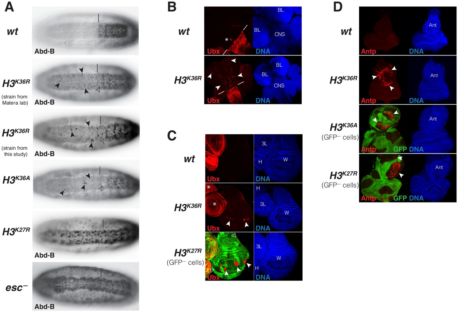 Figure 6. Drosophila with H3K36R or H3K36A chromatin show defective Polycomb repression at HOX genes.(A) Ventral views of stage 16 wildtype (wt), H3K36A, H3K36R, H3K27R, or esc (esc–) mutant embryos, stained with antibody against Abd-B protein; the esc mutant embryo lacked both maternal and zygotic expression of esc (see Materials and Methods for details of all genotypes). The vertical bar marks the anterior boundary of Abd-B expression in parasegment (ps) 10 in wt embryos. Note the stochastic misexpression of Abd-B protein in single cells or pairs of cells anterior to ps10 in H3K36R and H3K36A mutant embryos (arrowheads). H3K27R and esc mutant embryos show widespread misexpression of Abd-B protein in the head-to-tail pattern characteristic of PcG mutants. For reasons that are not well understood, H3K36A and H3K36R mutants also show partial loss of Abd-B expression in cells in ps10 (empty arrowheads). (B) Larval CNS and brain lobe tissues from wildtype (wt) or H3K36R mutant third instar larvae, stained with antibody against Ubx protein (red) and Hoechst (DNA) to label all nuclei; location of CNS and brain lobes (BL) are indicated in the right panel. The white bars mark the anterior boundary of Ubx expression in ps5 in wt embryos, the asterisk marks the Ubx-expressing cells in the central midline of ps4 that are part of the wild-type Ubx pattern. Note the stochastic misexpression of Ubx protein in many single cells anterior to ps5 in the CNS and in the brain lobes (arrowheads). (C) Imaginal wing (W), haltere (H) and 3rd leg (3L) discs from wildtype (wt) or H3K36R mutant third instar larvae and, as reference, discs from a larvae with clones of H3K27R mutant cells that are marked by the absence of GFP. In all cases, discs were stained with antibody against Ubx protein (red) and Hoechst (DNA) to label all nuclei. In wt animals, Ubx is expressed in the haltere and 3rd leg disc but not in the wing disc where it is repressed by the PcG machinery. Note that in H3K36R mutants, Ubx is misexpressed in small clusters of cells in the wing blade primordium of the wing disc (arrowheads) but remains repressed in the rest of the wing disc. Such misexpression was detected in 50% of wing discs (n = 28). As reference, a wing discs with H3K27R mutant clones is shown, where all cells in the clones in the wing blade primordium (arrowheads) show misexpression of Ubx whereas cells in the notum and hinge primordium show no misexpression (empty arrowheads) (cf. Pengelly et al., 2013). Also note that in H3K36R mutants (n > 30 mutant animals analyzed), Ubx expression in haltere and leg discs appears unperturbed (asterisks). (D) Eye-antennal imaginal discs from wildtype (wt) or H3K36R mutant larvae and below discs from larvae with clones of H3K36A or H3K27R mutant cells that are marked by the absence of GFP. All animals were stained with antibody against Antp protein (red) and Hoechst (DNA) to label all nuclei. Antp is not expressed in the eye-antennal disc of wt animals. Note that in H3K36R mutant discs, Antp is misexpressed in large clusters of cells (arrowheads) in the antenna primordium (Ant). Note that Antp is also misexpressed in H3K36A or H3K27R mutant cell clones in the antenna primordium (arrowheads) and that in these cases misexpression also only occurs in a subset of the mutant cells and not in all clones. |