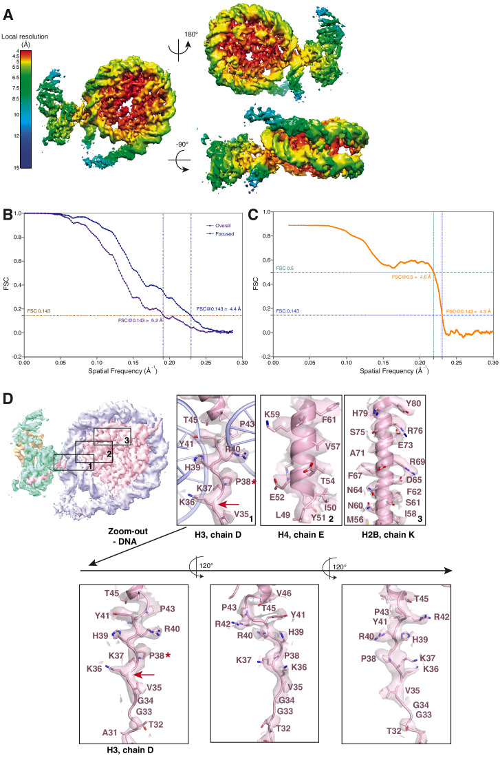Figure 1—figure supplement 3 Cryo-EM analysis of the focused EZH2sub-Nucsub map (related to Figure 1). (A) Local resolution estimation of the focused 4.4 Å EZH2sub:Nucsub reconstruction. Regions in the nucleosome core as well as the adjacent regions including parts of the H3 N-terminus close to the exit side of the nucleosome are well resolved (4.0–5.5 Å). Regions close to the mask, especially the nucleosomal DNA and parts of EZH2, are less well resolved (colors green to blue). (B) Global FSC generated from masked independent half maps of EZH2sub-Nucsub (Focused, blue line) and the overall PHF1-PRC2:di-Nuc (Overall, violet line) were plotted against spatial frequency. The resolution of 4.4 Å for EZH2sub-Nucsub map and 5.2 Å for the overall PHF1-PRC2:di-Nuc map were estimated according to the gold standard FSC cutoff of 0.143 (brown dotted line) (Rosenthal and Henderson, 2003) (C) FSC between the atomic model and the masked (applied in Phenix) map of EZH2sub-Nucsub after real-space refinement (Afonine et al., 2018). Green line represents the cut-off at 0.5 (4.6 Å) and blue line represents the cut-off at 0.143 (4.3 Å) (see also Supplementary file 1; Rosenthal and Henderson, 2003; Henderson et al., 2012; Rosenthal and Rubinstein, 2015). (D) Selected regions within EZH2sub-Nucsub showing side-chain density, e.g. K36 (red arrow). A red asterisk indicates the last residue of the H3 tail visible in known crystal structures (usually P38 or H39). The quality of the map around K36 is shown as a separate zoom-out below and in three different views to demonstrate the lack of anisotropy present in the density. |